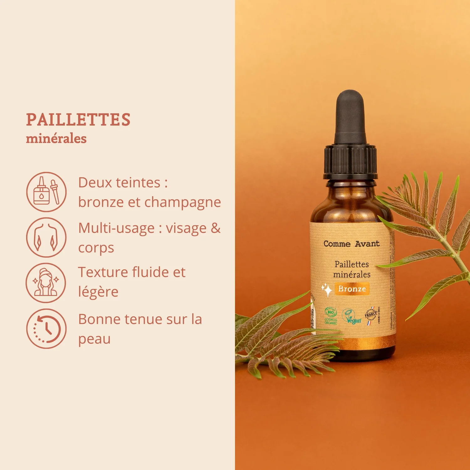 Découvrez nos paillettes minérales visage et corps. Texture fluide et légère, teintes adaptées à toutes les carnations.