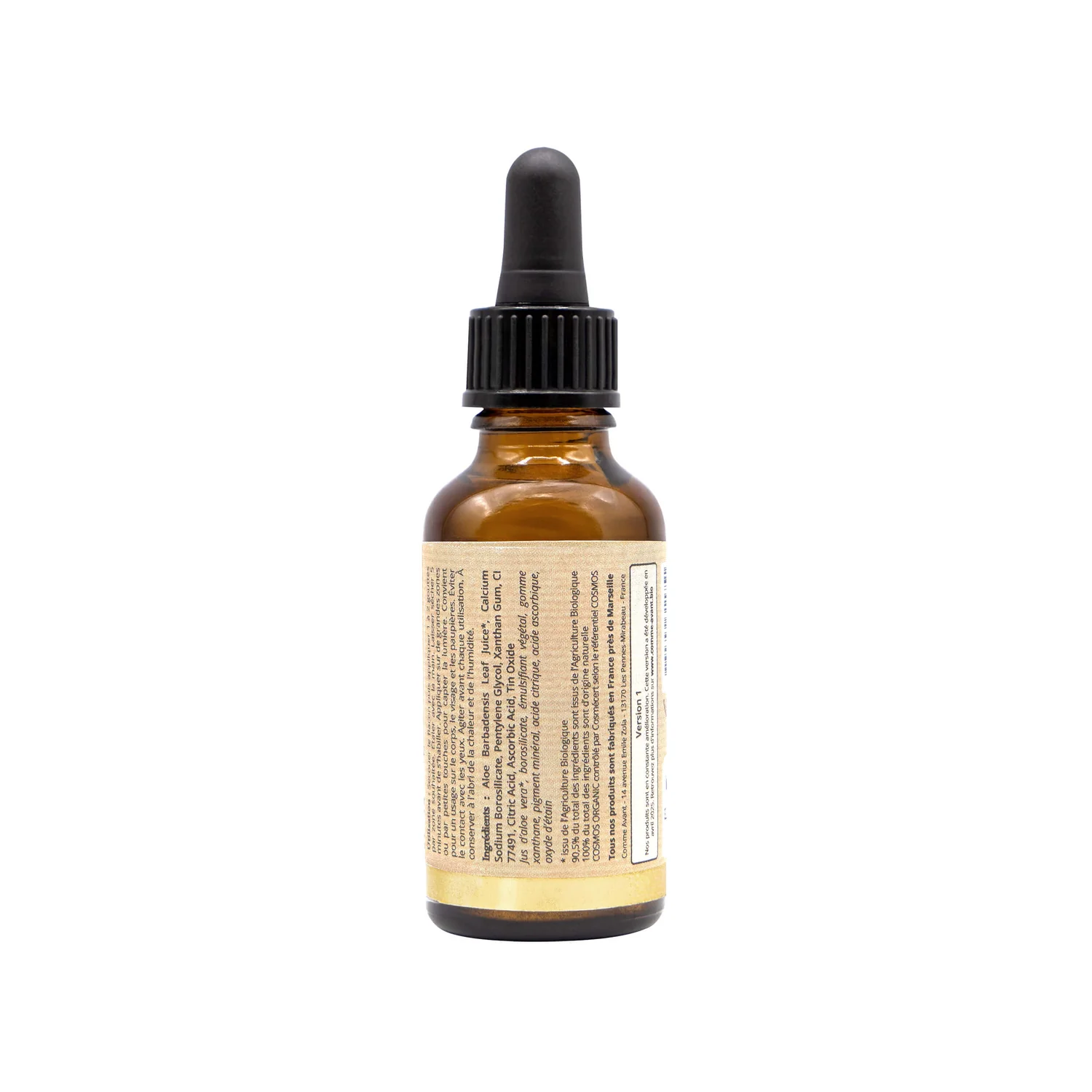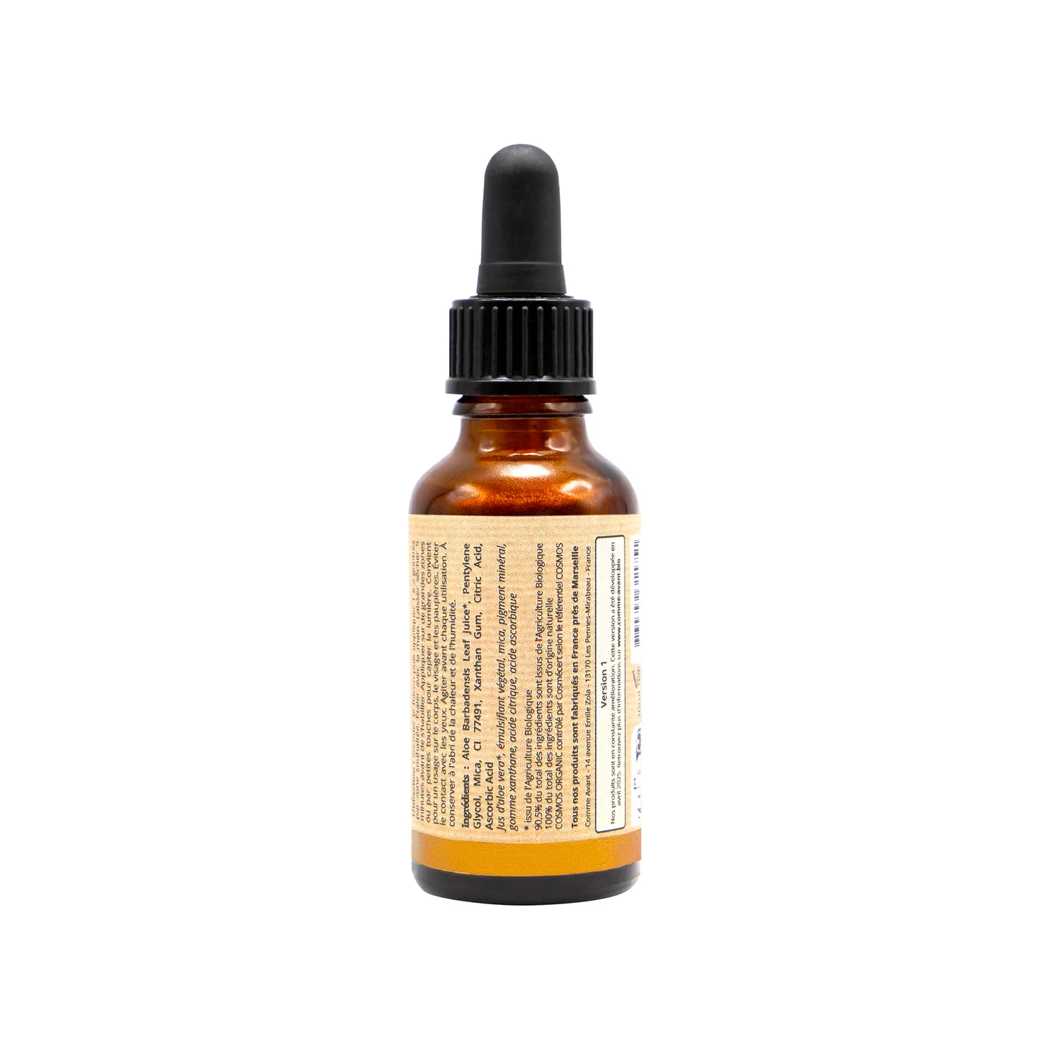- Composition Teinte Bronze : jus d’aloe vera, mica, émulsifiant végétal, gomme xanthane, pigment minéral, acide citrique, acide ascorbique