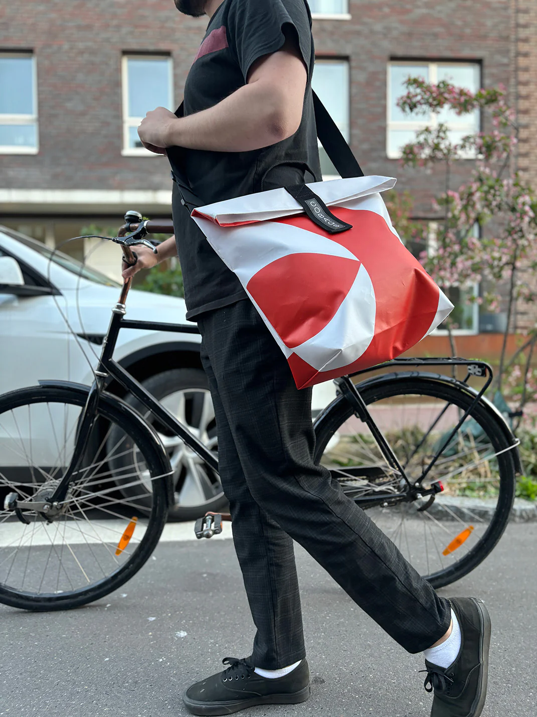 Réalisé à partir de bannières d’événements recyclés, chaque sac est unique, unique en son genre, et fabriqué avec des matériaux aseptisés et non toxiques, parfait pour un usage quotidien avec de l’espace et une poche intérieure pour l’essentiel. Il se ferme grâce à un rabat pour protéger l’intérieur du sac et son contenu.