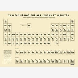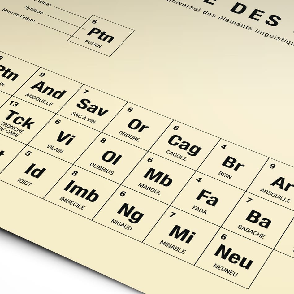 L’affiche scientifique “Le tableau périodique des jurons” classe et répertorie les différents types d’insultes en fonction de leurs propriétés ordurières. Cette affiche comptabilise pas moins de 97 éléments allant de Ducon à pine d’huître en passant par Fils de p**te. Un véritable objet indispensable à afficher dans toutes les salles de classe !