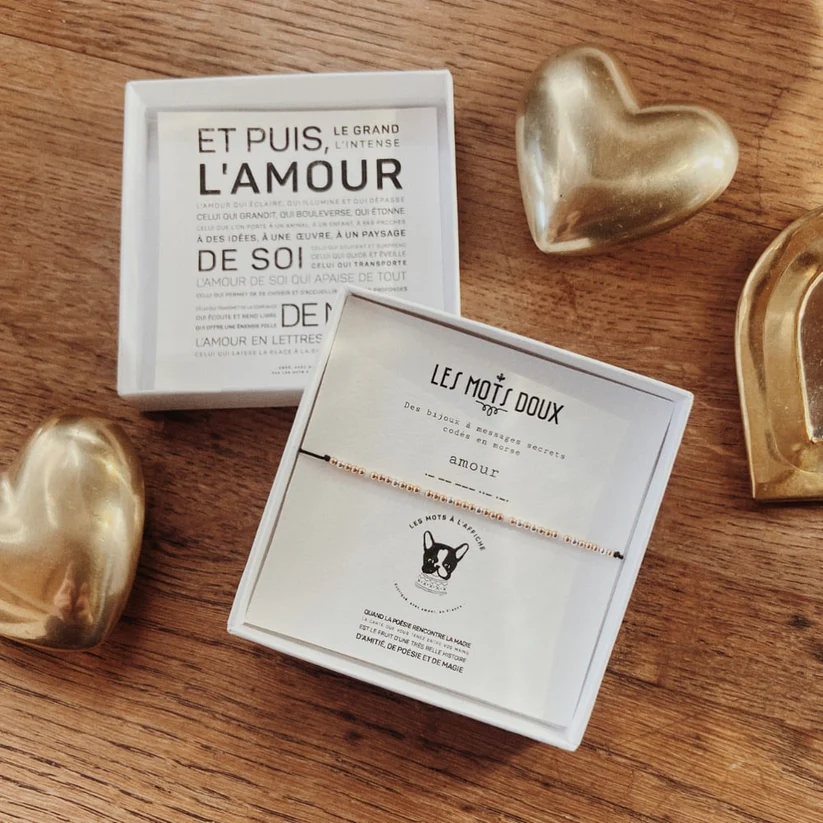 Les perles plaquées or et argent reprennent le code de l’alphabet morse pour traduire un mot. Ici, AMOUR.