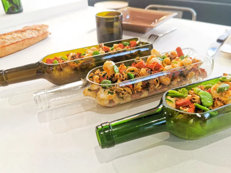 A utiliser comme plateaux pour des présentations culinaires chics & originales. Mais ce n’est pas tout ! Car nos DEMI(pas si ;)PLATES sont aussi des PLATS, qui peuvent être adaptés à certains modes de cuisson (modérés et doux, >100°C )…. mais attention, elle reste une bouteille en verre et ne résiste pas à toutes les chaleurs