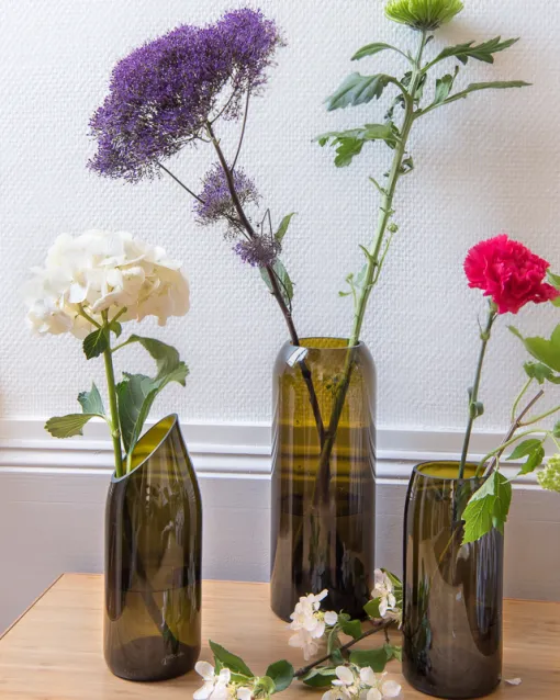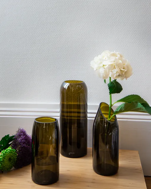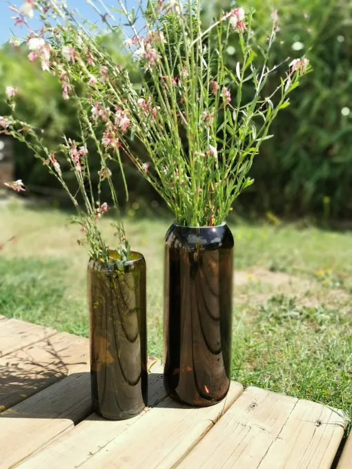 ; toutes réalisées à la main. Les teintes, les tailles ou encore les épaisseurs varient selon les bouteilles offrant ainsi une palette de nuances et de « grosseurs » subtiles mais surtout UNIQUE à chacun.