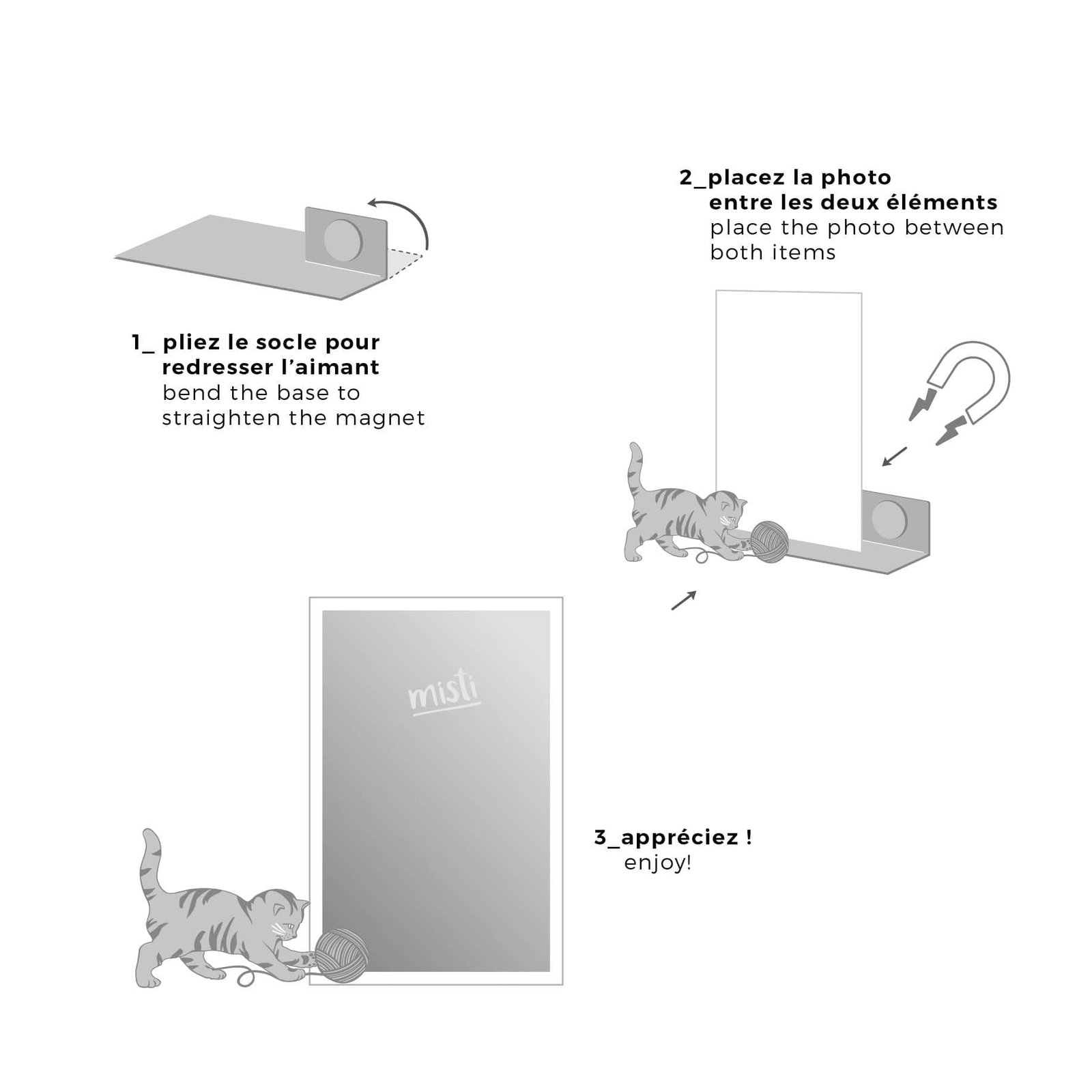 Pliez tout simplement le pied vers l’arrière, placez votre photo entre les 2 éléments magnétiques et le tour est joué ! Une photo souvenir joliment présentée et exposée dans votre salon ou sur votre bureau.